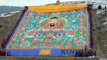 甘肃省夏河县拉卜楞寺晒佛台上展开一幅巨型佛像。